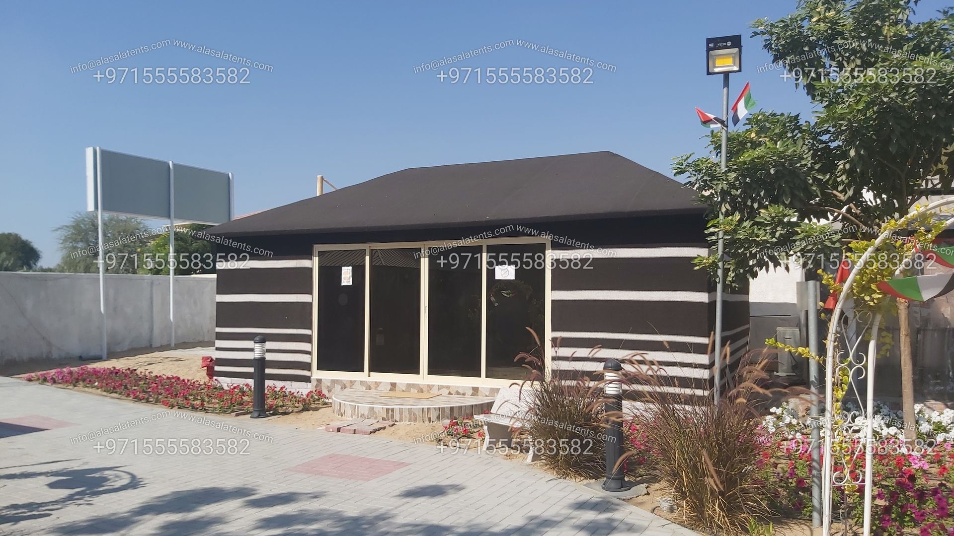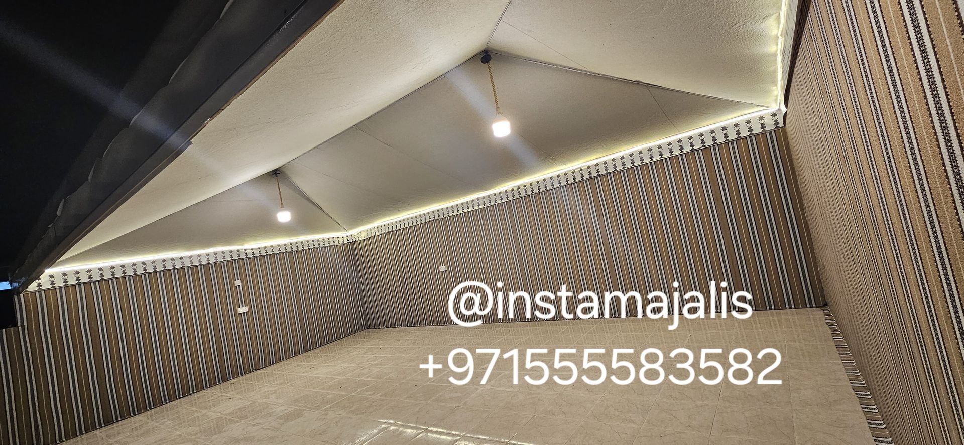 خيمة مجلس ملكي دائمة صيفي شتوي تتكون من سقف قرميد معدني مع جوانب حسب الطلب ( طربال أو شعر أو صبغ) وجدران اسمنتبورد مع العوازل الحرارية والمطرية (وديكور قماش داخلي أو جبسمبورد) ومجهزه بقواعد للمكيفات مع امكانية اختيار اللون الخارجي والداخلي للخيمة حسب الطلب